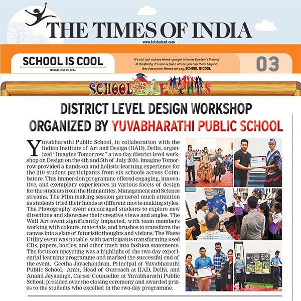Yuvabharathi's Career Guidance Cell, in collaboration with the Indian Institute of Art and Design (IIAD), Delhi, organized "Imagine Tomorrow," a two-day district-level workshop on Design on the 4th and 5th of July 2024. Imagine Tomorrow provided a hands-on and holistic learning experience for the 210 student participants from six schools across Coimbatore. This immersion programme offered engaging, innovative, and exemplary experiences in various facets of design for the students from the Humanities, Management and Science streams.