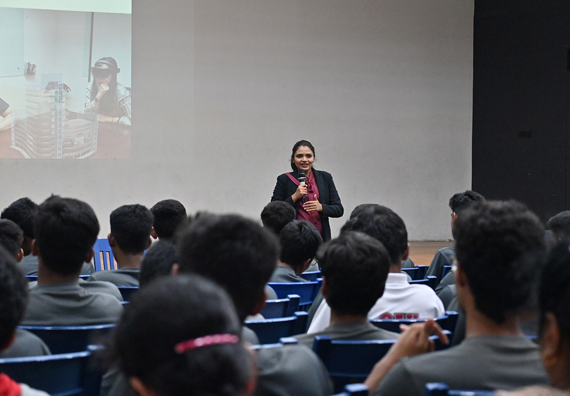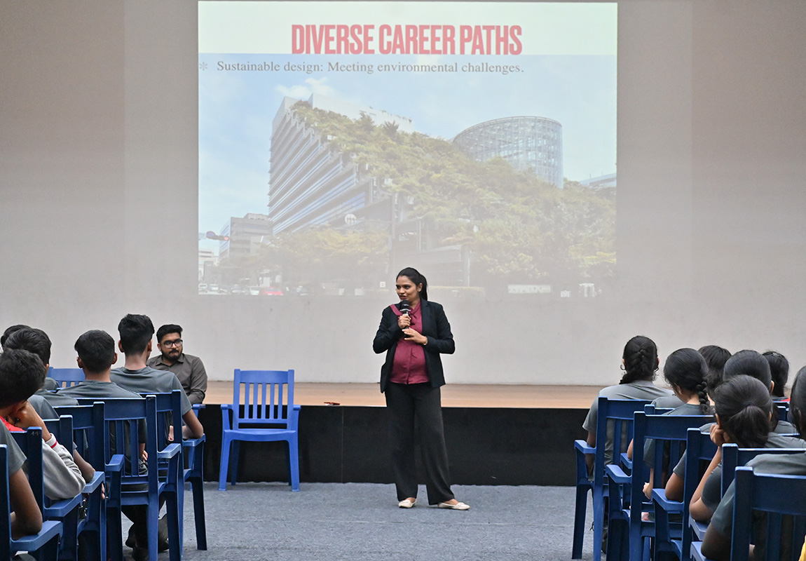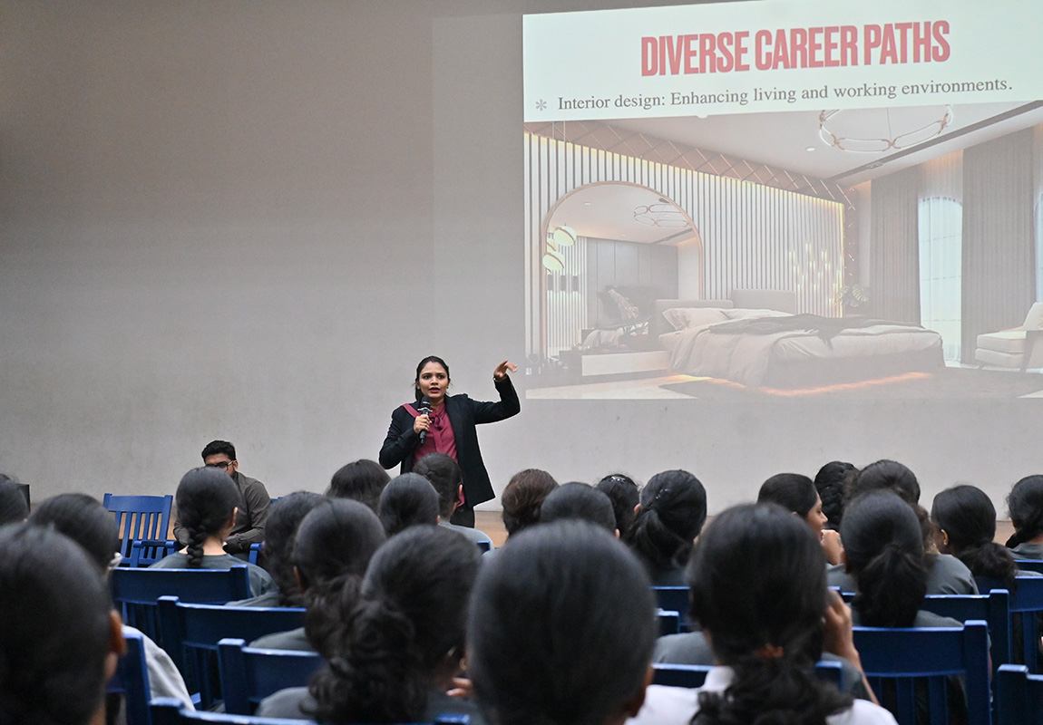 The programme had two sessions: The first session was conducted by Mrs Shribu, a sustainable architect with rich experience in 100% traditional construction and cement fusion buildings. Her talk broadened students’ perspectives on the significance of sustainability and innovation in the field of architecture. The second session was conducted by Mr. N.Ahamed Shahabath, Founder & CEO of I-Arch and Street Arabiya. He highlighted the scope of architecture as a career and guided students on the importance of NATA/JEE examinations. The session was highly interactive, with students actively engaging and seeking clarifications on career prospects, preparation strategies, and the nature of work in architecture. Both speakers addressed their queries with clarity and enthusiasm, leaving students motivated and better informed. The programme not only created awareness about the NATA/JEE (B.Arch.) entrance examinations but also inspired students to view architecture as a career that balances creativity, sustainability, and innovation.