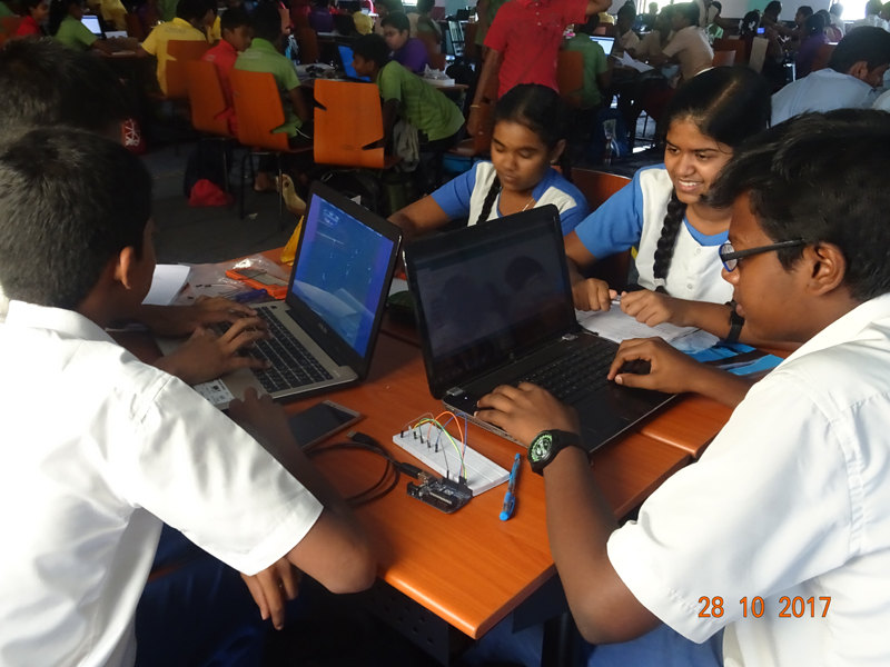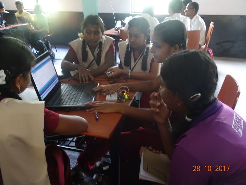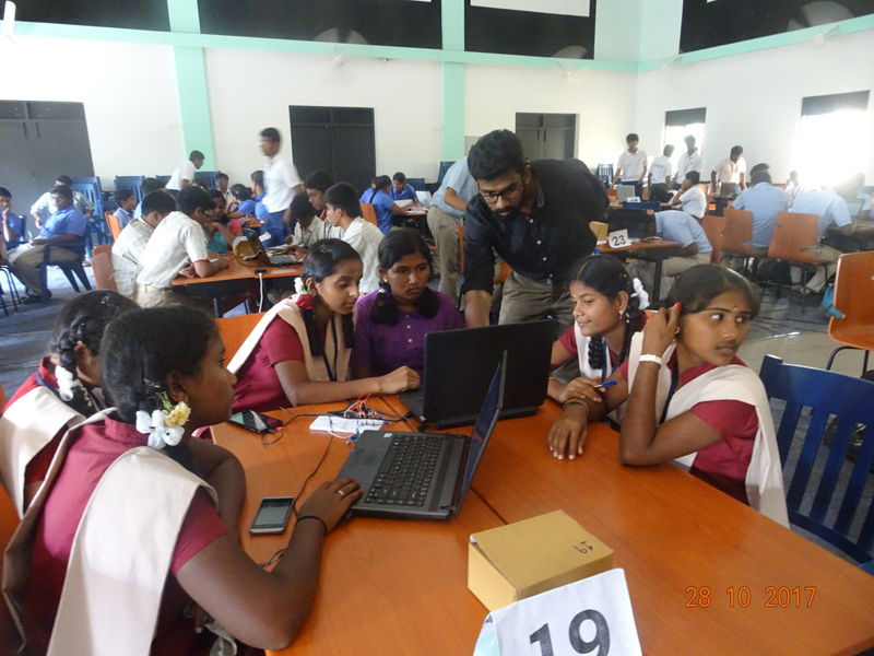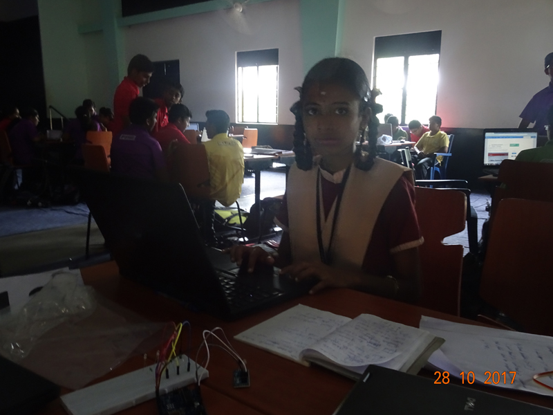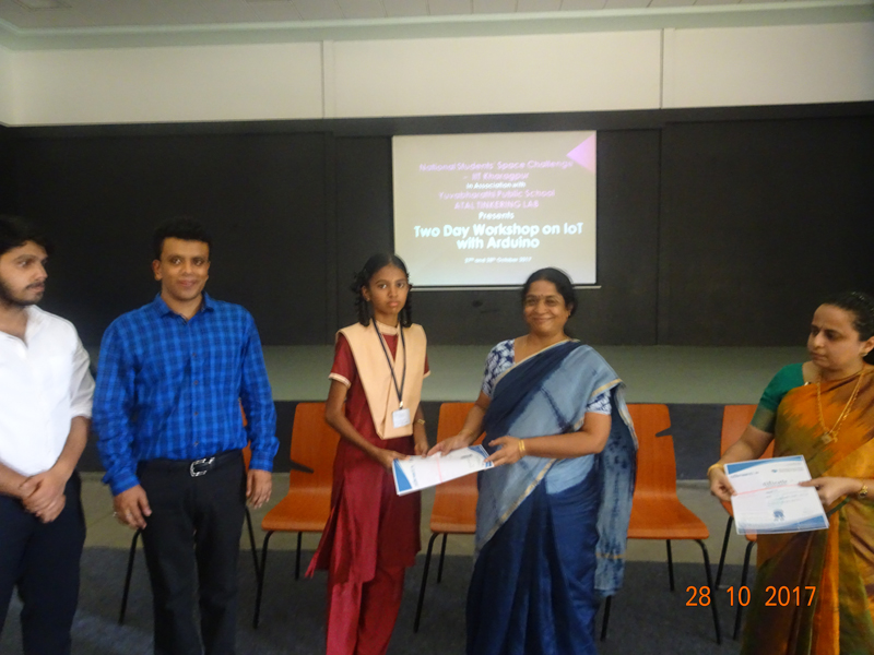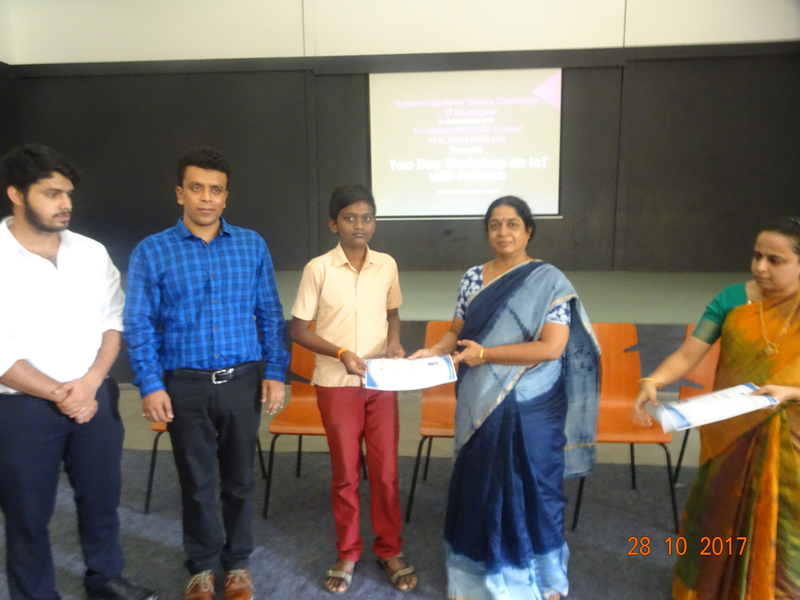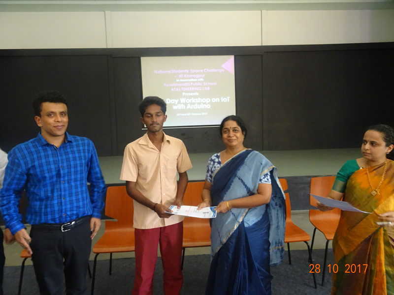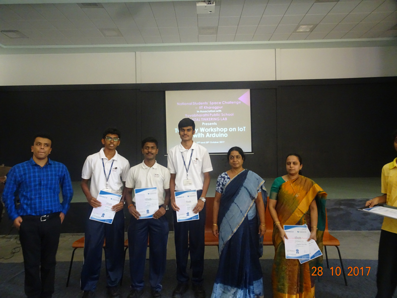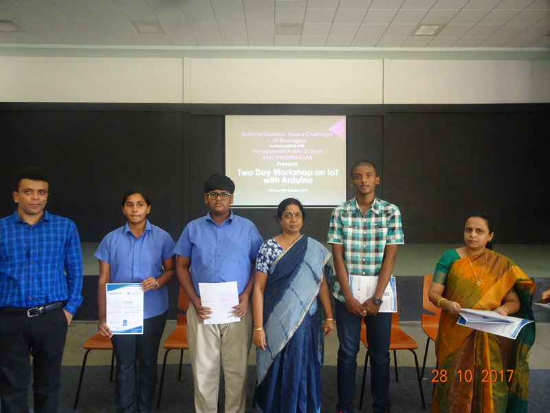 A Two day workshop on “IoT with Arduino” was conducted on the 27th and 28th of October 2017 at Yuva Enclave. National Students’ Space Challenge –IIT Kharagpur and Wingfotech Private Limited, Delhi in association with Yuvabharathi Public School’s Atal Tinkering Lab conducted this workshop. 84 students from Yuvabharathi, 55 students from other Matriculation and CBSE schools and 11 students from Government and Corporation schools attended the workshop (Total number of participants -150). A competition was conducted at the end of the workshop. Five teams were selected for the final round to be held at IIT ,Kharagpur by name UTKRAANTI 2018 next year. Four of the five teams are from Yuvabharathi and one team is from Bharathi Matric Hr. Sec. School. It should be noted that one of the winning teams has two Government school students (Sabari from Govt. School, Kalveerampalayam and Gnanamsoundarya from SS Kulam Govt. Higher Secondary School, Kovilpalayam).