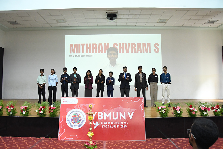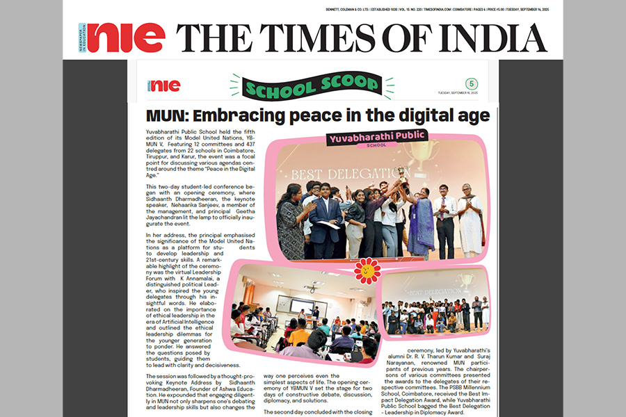 Yuvabharathi Public School held its fifth edition of the Model United Nations, YBMUN V, on August 23rd and 24th, 2025. With 12 committees and 437 delegates from 22 schools in Coimbatore, Tiruppur, and Karur. The conference discussed various topics centred around the theme "Peace in the Digital Age."