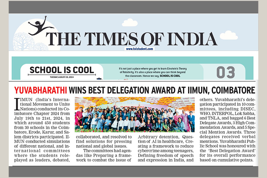 Yuvabharathi Public School bagged the Best Delegation Award for its overall performance based on cumulative points.