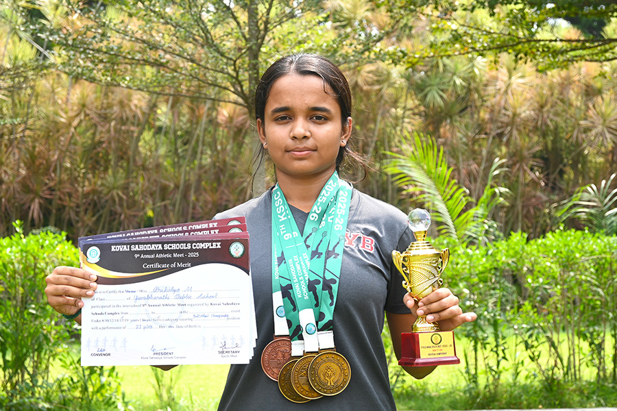 In the 9th Kovai Sahodaya Schools Complex 2025 Athletics Meet, Yuvabharathi showcased outstanding performance by securing 20 Gold, 16 Silver, and 22 Bronze medals.In the under-19 category, the following students set new Meet Records: Adhav K of grade 12 in the 800m and 1500m, and Jayanth C B of grade 12 in the 100m. Jayanth, Sanjeev Nanjaiah, Nebin Bose, Abhinav, and Dhureen set a Meet Record in the 4x100m relay.