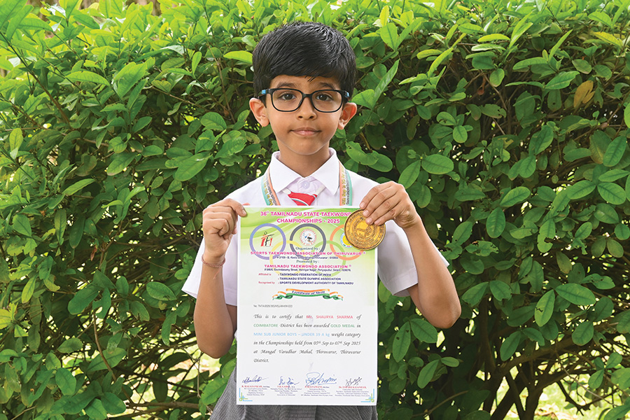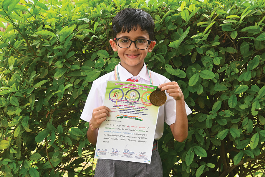 Shaurya Sharma and Shivaay Sharma of Grade 1 participated in the 38th Tamil Nadu State Taekwondo Championship 2025, organised by the Sports Taekwondo Association of Thiruvarur from the 5th to the 7th of September, 2025, at Thiruvarur District. In the Mini Sub-Junior Boys division, Shaurya Sharma secured the Gold Medal in the under-19 A Kg weight category, and Shivaay Sharma secured the Gold Medal in the under-20 B Kg weight category.