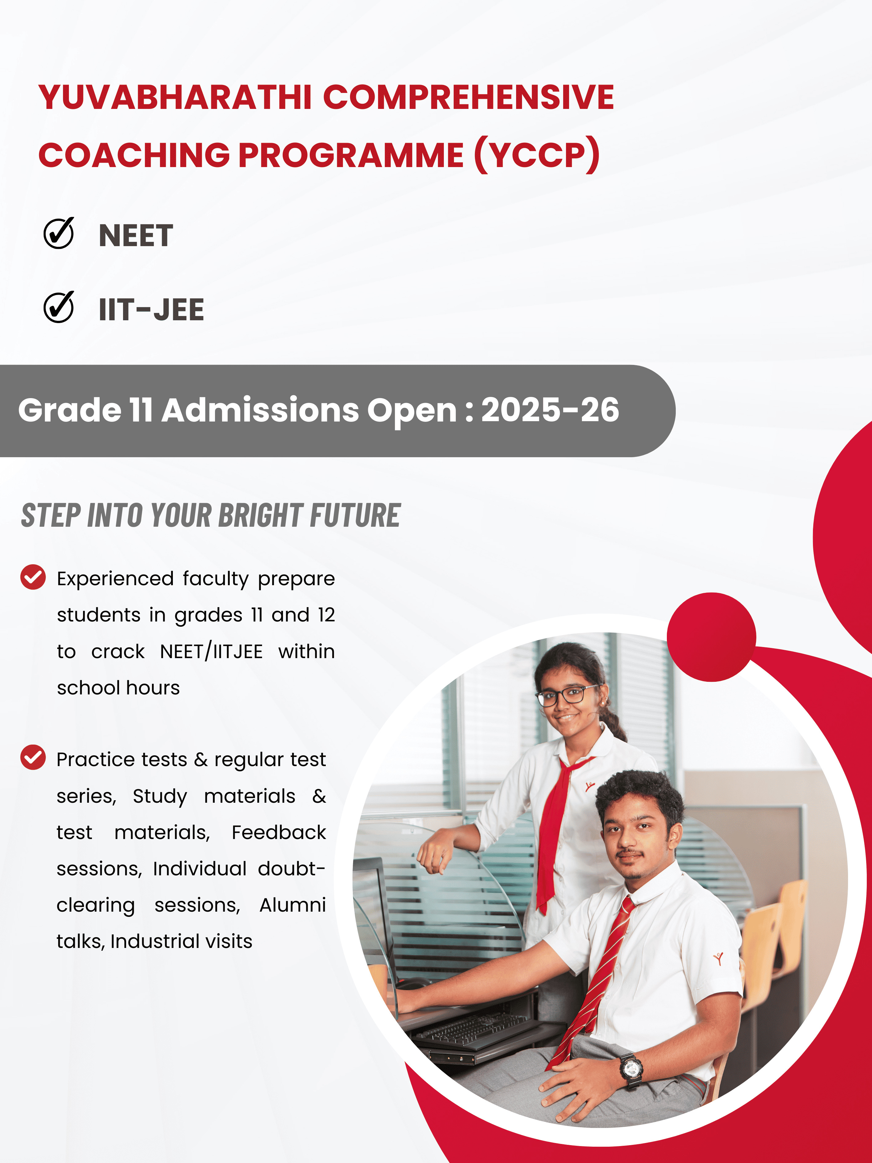 Yuvabharathi's Comprehensive Coaching Programme prepares students in grades 11 and 12 (Engineering and Medical streams) within school hours to crack the NEET and IIT-JEE examinations.